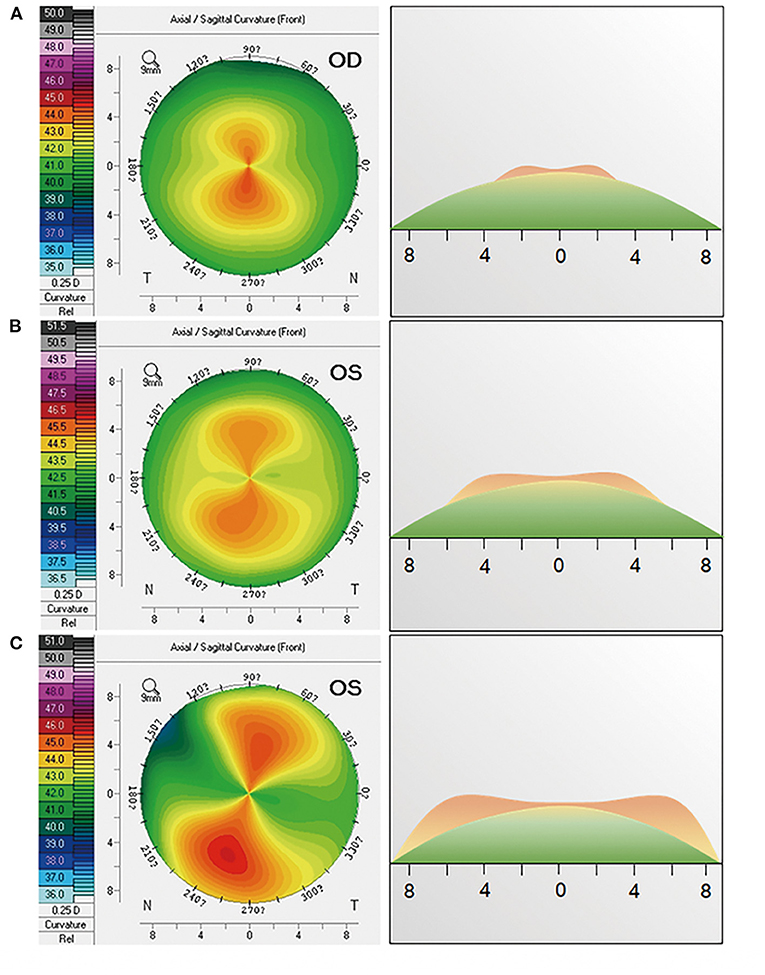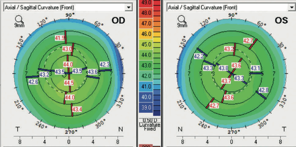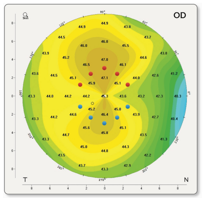 위 그림은 난시가 1디옵터 미만으로 거의 없는 각막으로, 지형도가 어떤 패턴이 보이지 않고 전반적으로 색이 고른 것을 볼 수 있습니다.