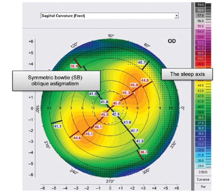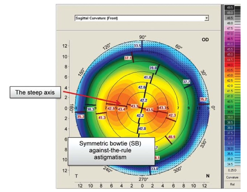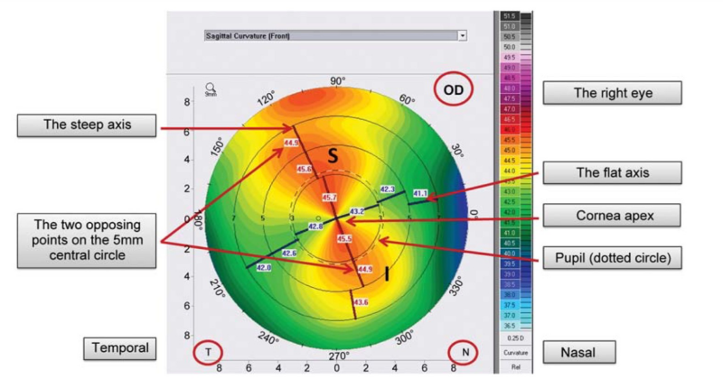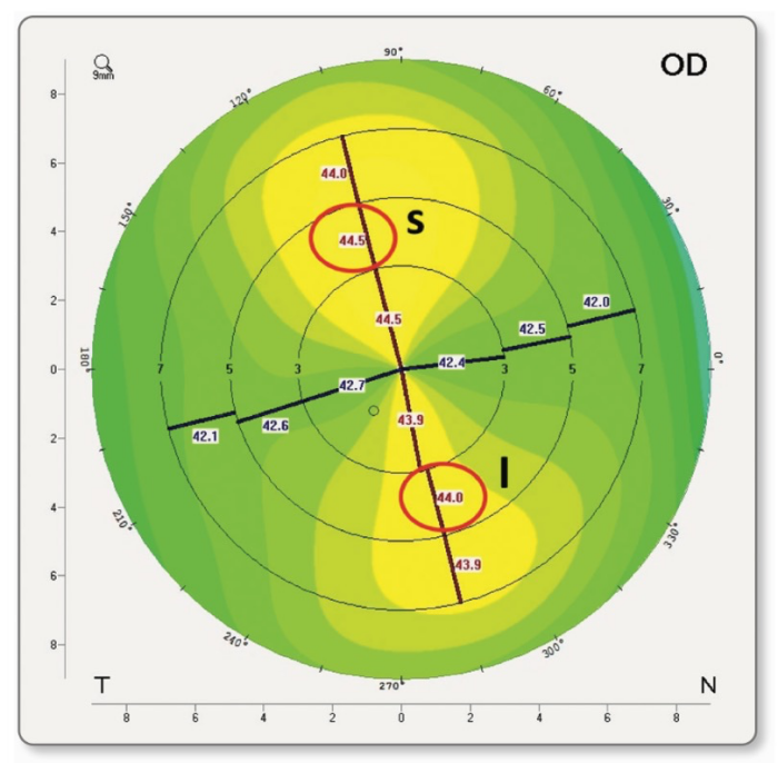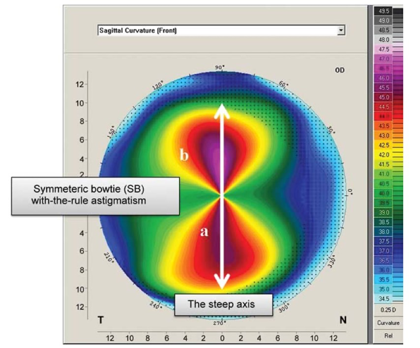 따라서 수직으로 각막이 가파르구나, 그리고 대칭적으로 모양도 좋구나 = 규칙 직난시가 있구나 이렇게 알 수 있습니다.