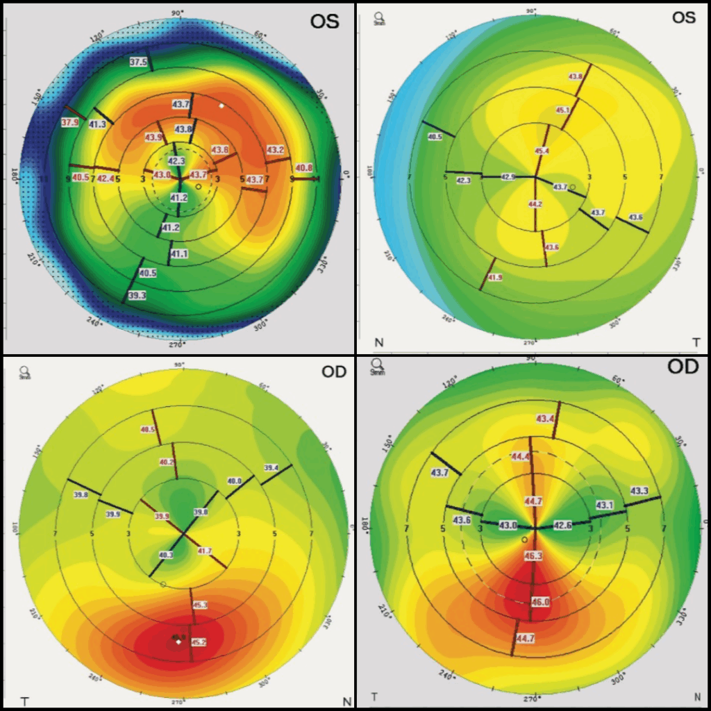 이런 모양이라 하더라도, 평균 각막 곡률(Km)이 48 이상이라면 비정상 각막일 수도 있어 해석에 유의해야 합니다.