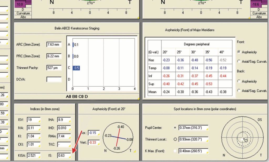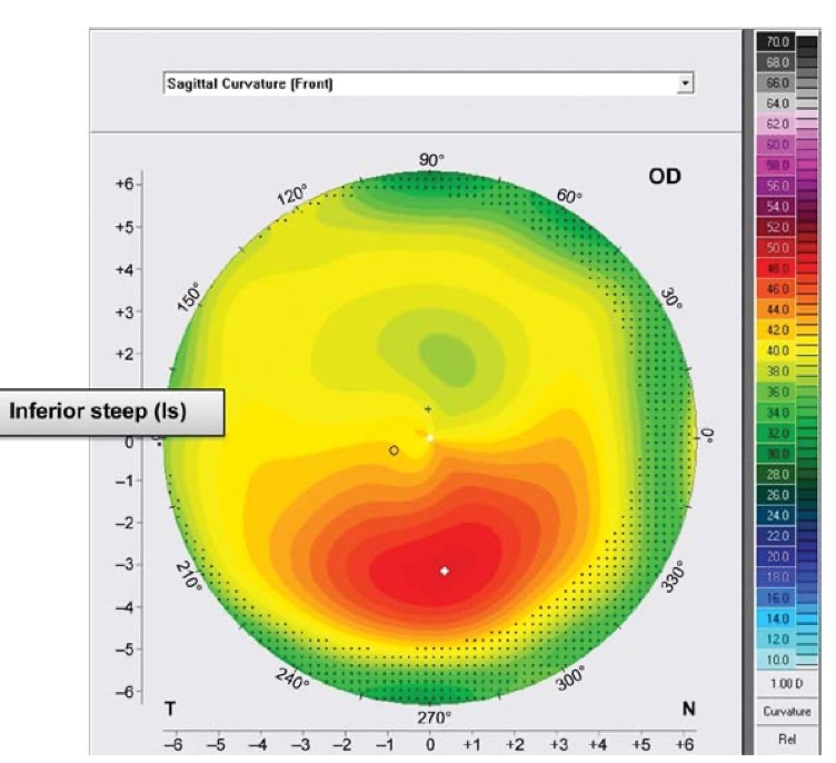 특히 하측이 가팔라지는 형태 (IS, AB/IS)는 초기 원추각막에서 나타나는 매우 유명한 형태이니 조심해야 합니다.