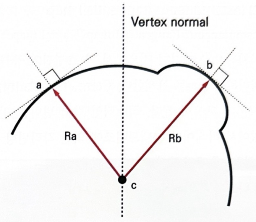 a와 b 지점의 각막 곡률은, 각 지점의 법선(접선에 수직인)이 중심축과 만나는 c를 중심으로 구하게 됩니다.